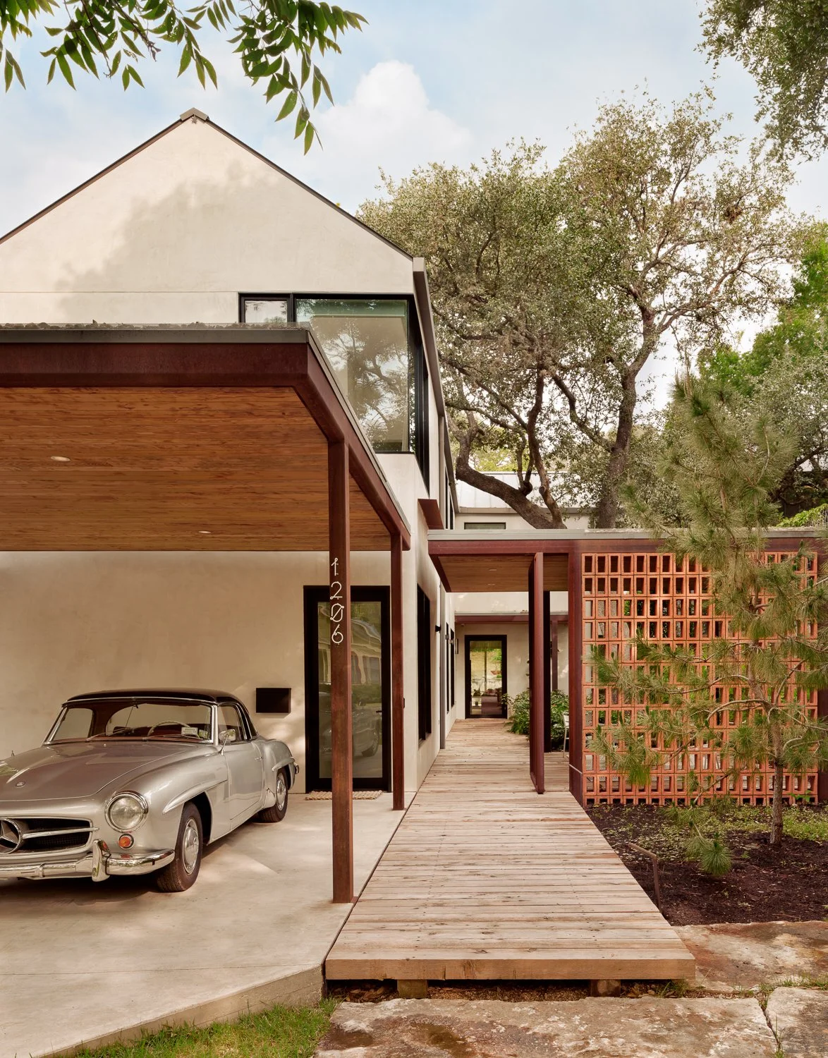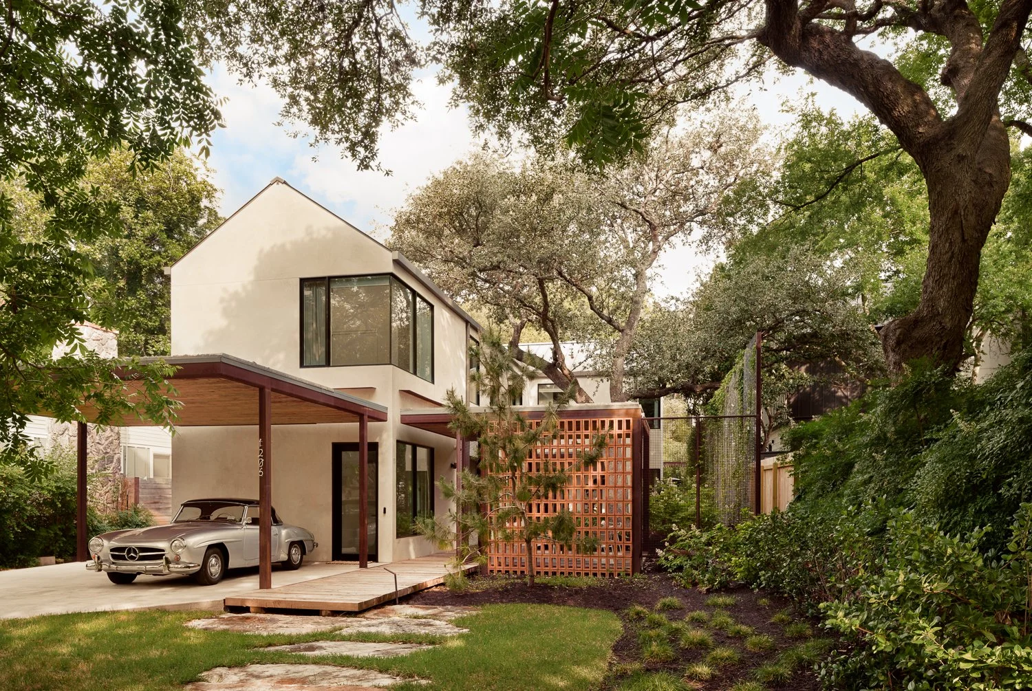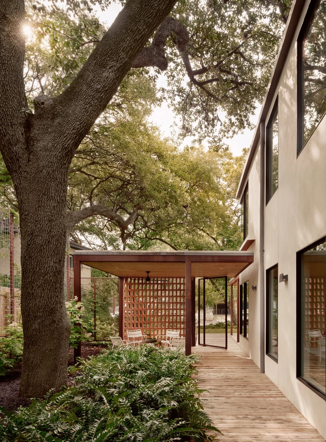 In this Travis Heights home, mature pecan trees in the front yard cover a fieldstone path.