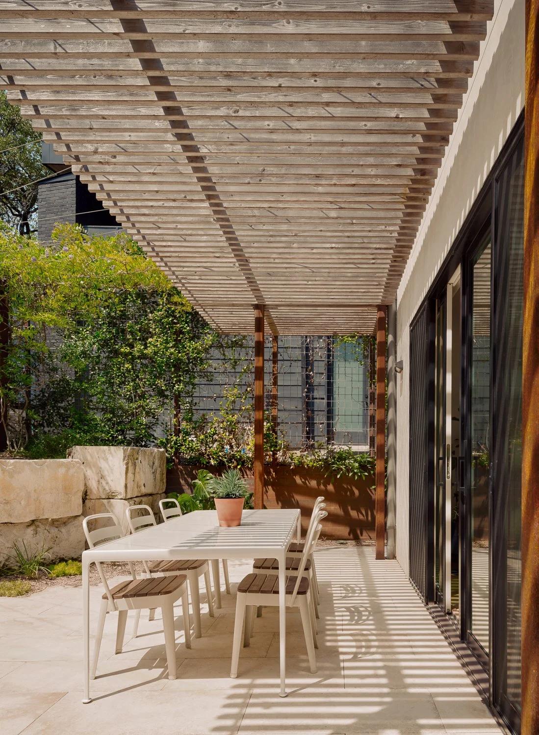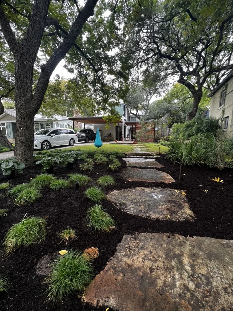 A large limestone block wall terraces a lush back yard highlighted by fruit trees, including Loquat, Fuyu Persimmon and understory staples, Texas Mountain Laurel and Texas Redbud.